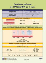 В таблиците е представено най-важното от учебното съдържание за 3. клас, свързано с: числата до 1000: записване, четене; сравняване; образуване на редицата на числата до 1000; представяне на числата като сбор от редни единици; връзки между редните единици; събиране и изваждане на числата до 1000; умножение и деление на числата до 1000 с едноцифрено число; разпределително свойство на умножението и делението относно събирането; намиране на част от цяло (половинка, третинка, четвъртинка и десетинка); намиране на неизвестно умаляемо и неизвестно делимо; текстови задачи в косвена форма и графично представяне на текстова ...