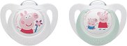 Ортодонтичните залъгалки на NUK са с дизайн вдъхновен от любимия анимационен герой Peppa Pig. Те са подходящи за бебета от 18 до 36 месеца и са чудесен начин за успокоение на детето. Широката и плоска основа на залъгалките намалява натиска върху зъбите и челюстта, което спомага за предотвратяване на зъбни и ортодонтски проблеми. Долната им част е гладка и осигурява допълнително пространство за естествени сукателни движения, което подпомага правилното развитие на сукателния рефлекс. Биберонът им е изработен от мек и деликатен силикон и не дразни детските венци. Той е оформен като майчиното зърно по време на кърмене за ... |