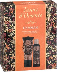 Подаръчният комплект от Tesori d'Oriente съдържа душ крем и дезодорант. Те са от серията Hammam и притежават чувствен аромат, който ще достави истинска наслада на сетивата ви. Той съчетава цветни нотки жасмин самбак със свежи нотки портокалов цвят. Душ кремът ще се погрижи за красивия вид на кожата ви и ще изпълни банята с прекрасен релаксиращ аромат. Формулата му е обогатена с масло от арган, което има подхранващи, хидратиращи и подмладяващи свойства. Кремообразната текстура образува галеща пяна, която почиства нежно кожата. След душ, тя остава копринено гладка, мека и еластична. Дезодорантът предпазва от ...