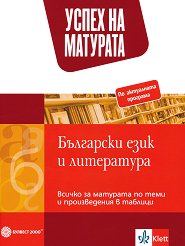 Помагалото "Всичко за матурата по теми и произведения в таблици" от поредицата "Успех на матурата" е предназначено за подготовка на учениците за задължителния държавен зрелостен изпит по български език и литература. Изданието е създадено в съответствие с новата учебно-изпитна програма по български език и литература за задължителната матура (в сила от учебната 2021 / 2022 година). Помагалото включва: най-важната информация по български език и литература от 11. клас и 12. клас, представена в таблици по теми и произведения; два компонента - "Български език" и "Литература"; ... |