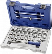 Комплектът на Expert е изработен от хром-ванадиева стомана за висока издръжливост и здравина. Съдържа вложки, удължения, кардани, битове, 2 тресчотки, адаптери и ръкохватка за вложки. Накрайниците имат 1/4" и 1/2" захват и се предлагат в удароустойчив куфар за съхранение. Вид и размери на накрайниците: вложки 1/4" ∅ 4 mm ∅ 5 mm ∅ 5.5 mm ∅ 6 mm ∅ 7 mm ∅ 8 mm ∅ 9 mm ∅ 10 mm ∅ 11 mm ∅ 12 mm ∅ 13 mm удължени вложки 1/4" ∅ 6 mm ∅ 8 mm ∅ 10 mm ∅ 11 mm ∅ 12 mm ∅ 13 mm ∅ ... |