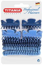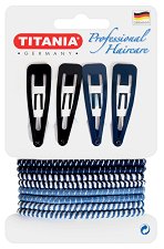 Комплект аксесоари за коса от "Titania", който включва 4 щипки и 4 ластика за коса във свежи сини цветове. Щипките са с дължина 4.5 cm и са със зъбчета от вътрешната страна, за да осигурят стабилно закрепване. Съчетани с ластиците за коса в същата цветова гама, те са перфектни за оформяне и фиксиране на желаната прическа. ... |