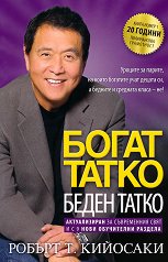 Актуализиран за съвременния свят и с 9 нови обучителни раздела. 20 години книга номер 1 по финансова грамотност. ... Уроците за парите, на които богатите учат децата си, а бедните и средната класа - не. Робърт Кийосаки промени начина, по който милиони хора по света мислят за парите. Той притежава репутация на човек, чиито възгледи често противоречат на конвенционалното мислене със своята смелост и безкомпромисна откровеност. Той е световно признат експерт по финансова грамотност. "Главната причина хората да имат финансови затруднения е, че те прекарват години в учене в училище, без да научат нищо за парите. ... |