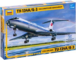 Моделът е произведен по лиценз на КБ "Туполев". ... Мащабно умален сглобяем модел от пластмаса на съветски пътнически самолет - Ту-134А/Б-3. Брой части: 58 Дължина на модела: 28.5 cm За да може да сглобите и залепите този макет, ви е необходимо лепило. Елементите на модела са направени от едноцветна пластмаса. Моделът може да се оцвети с боички. За Ту-134 Ту-134 (по обозначенията на НАТО - "Crusty") е съветски пътнически самолет за полети на къси и средни разстояния. Разработен е в началото на 60-те години от конструкторското бюро "Туполев", влиза в серийно производство през 1966- ...