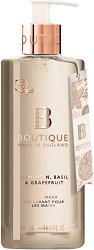 Течният сапун от Boutique почиства грижовно кожата на ръцете. Той притежава свеж и едновременно пикантен аромат, включващ нотки мандарина, босилек и грейпфрут. Формулата нежно почиства, подхранва и защитава кожата, без да я изсушава. Обогатена е с млечна киселина, която притежава регенериращи, подмладяващи, овлажняващи, противовъзпалителни и антибактериални свойства. След измиване, кожата остава мека, освежена и деликатно ароматизирана. Прекрасното ухание на сладка и сочна мандарина ще ви достави усещане за релакс и спокойствие. Живият, пиперлив аромат на свеж босилек и акцентите на месест грейпфрут ободряват ...